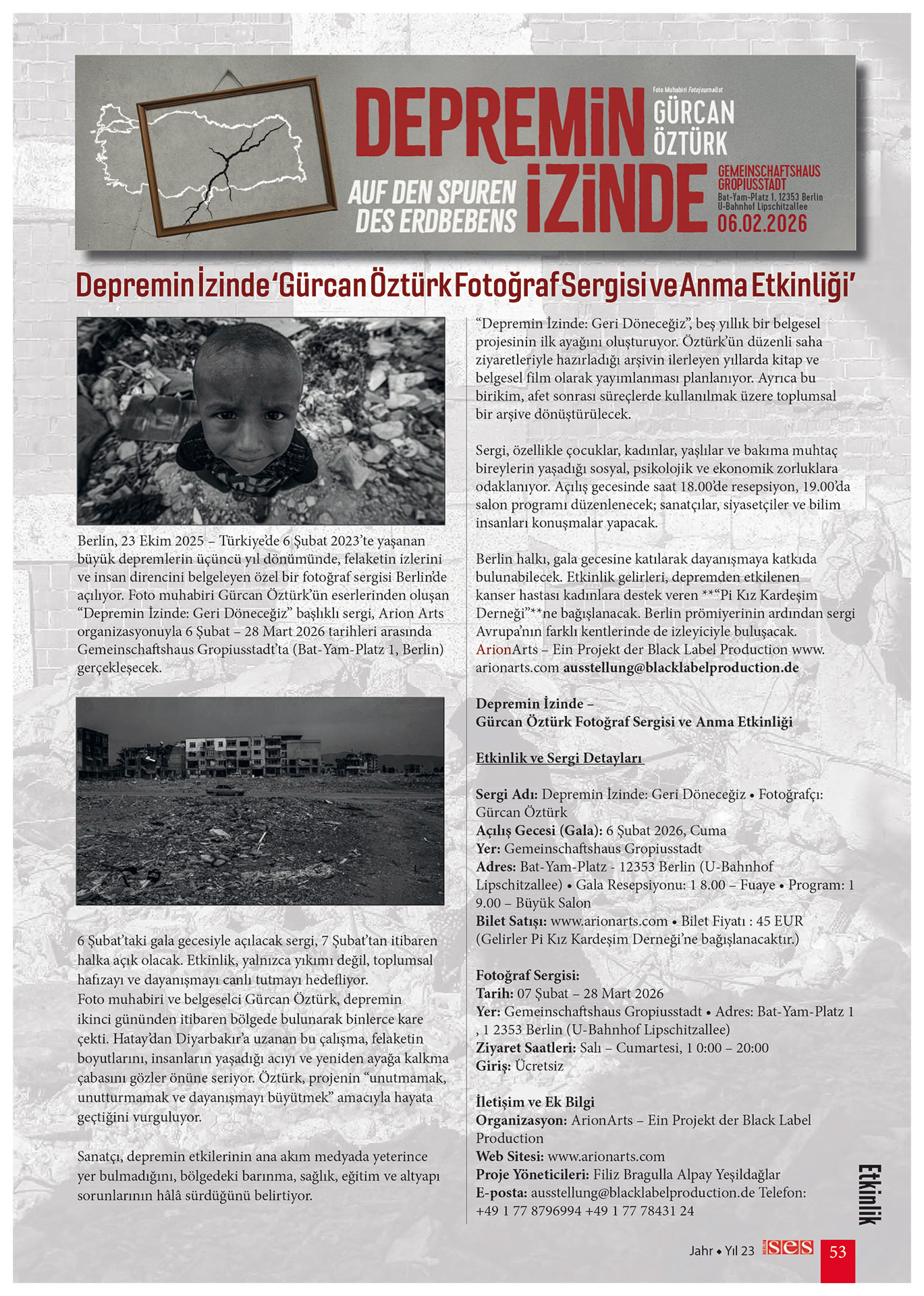 Im dritten Jahr dieses insgesamt geplanten fünfjährigen Dokumentationsprozesses wird im Rahmen des Projekts „Auf den Spuren des Erdbebens: Wir werden zurückkehren“ eine besondere Foto-Dokumentar-Ausstellung in Berlin veranstaltet. Diese Fotoausstellung soll die katastrophalen Folgen des Erdbebens auf Menschen, Tiere und Städte sichtbar machen, durch die Fotos das kollektive Gedächtnis bewahren und zur Solidarität beitragen. Angesichts der sozialen, psychologischen und wirtschaftlichen Folgen des Erdbebens ist diese Ausstellung besonders den verwundbarsten Gruppen gewidmet – Kindern, Frauen und älteren Menschen.
